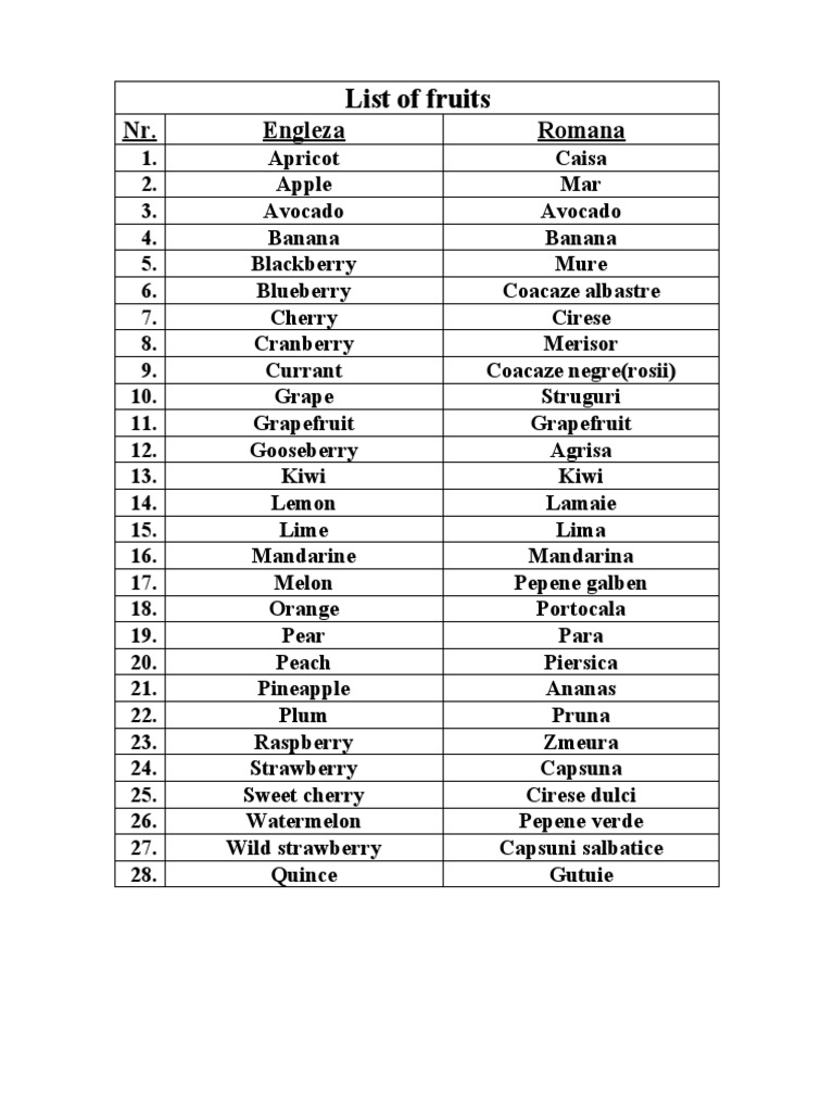 List Of Fruits Nr Engleza Romana Fruit Vegetables