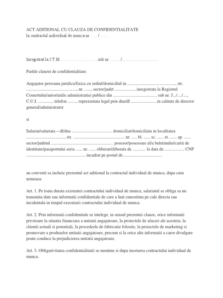 Model De Act Aditional Cu Clauza De Confidentialitate