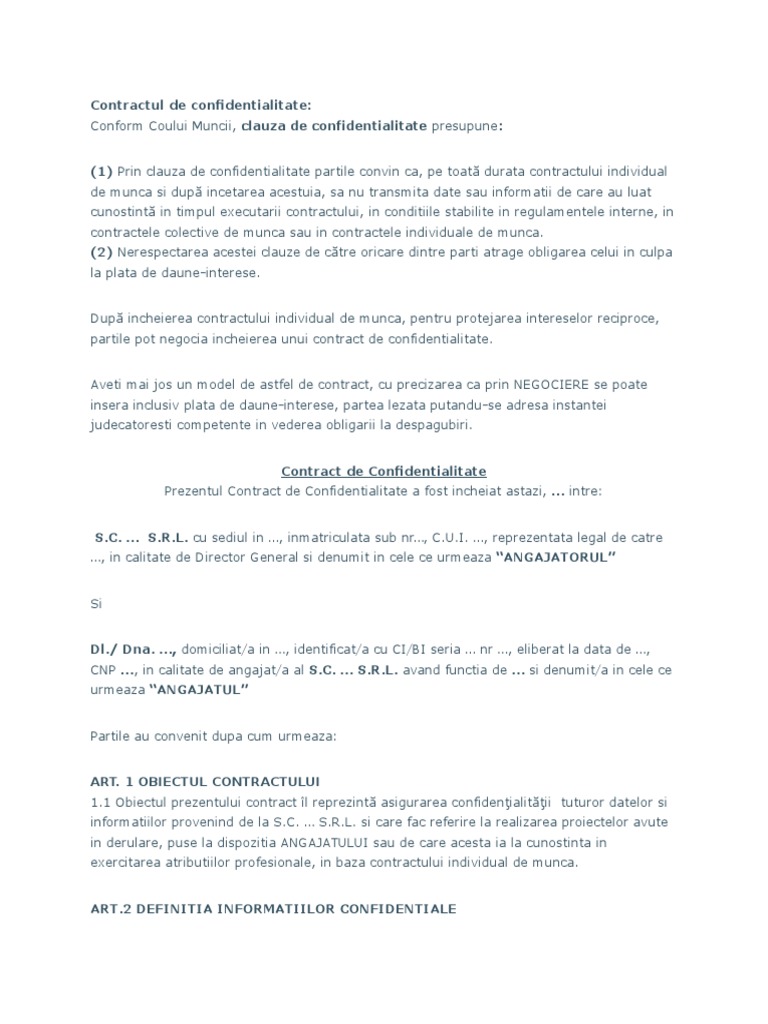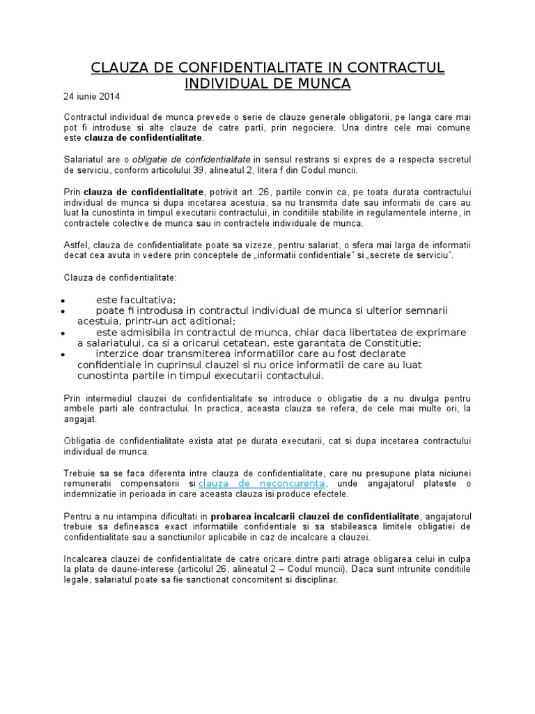 Clauza De Confidentialitate La Contractul Individual De Munca