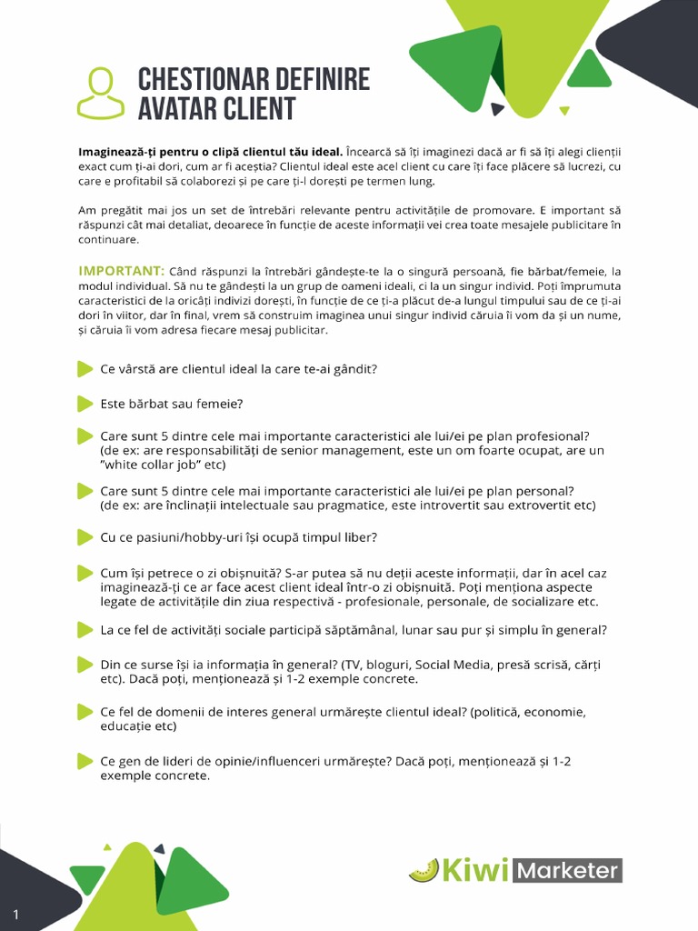 Kiwi Marketer Chestionar Definire Avatar Client