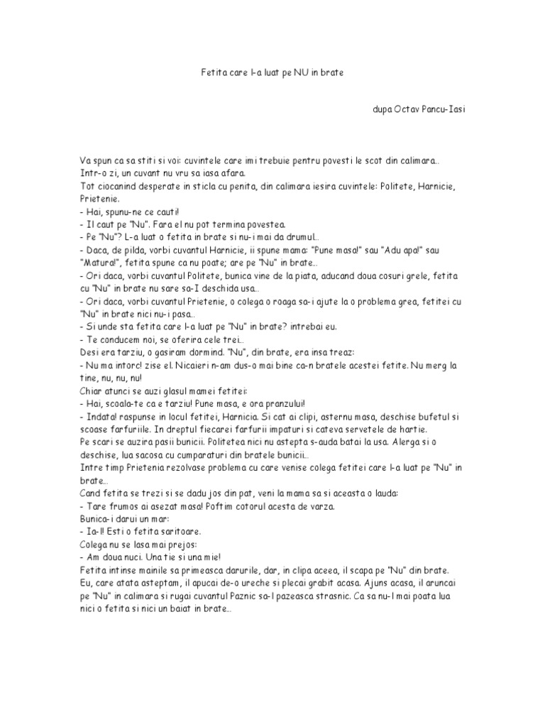 Fetita care la luat pe nu in brate. Vă spun ca să știți si voi. Fisa de exersare la limba romana by vioricapanco. Câștigă puncte și ajută ți echipa să i învingă pe crocobeți. Fetiţa care l a luat pe nu în braţe după octav pancu iaşi.